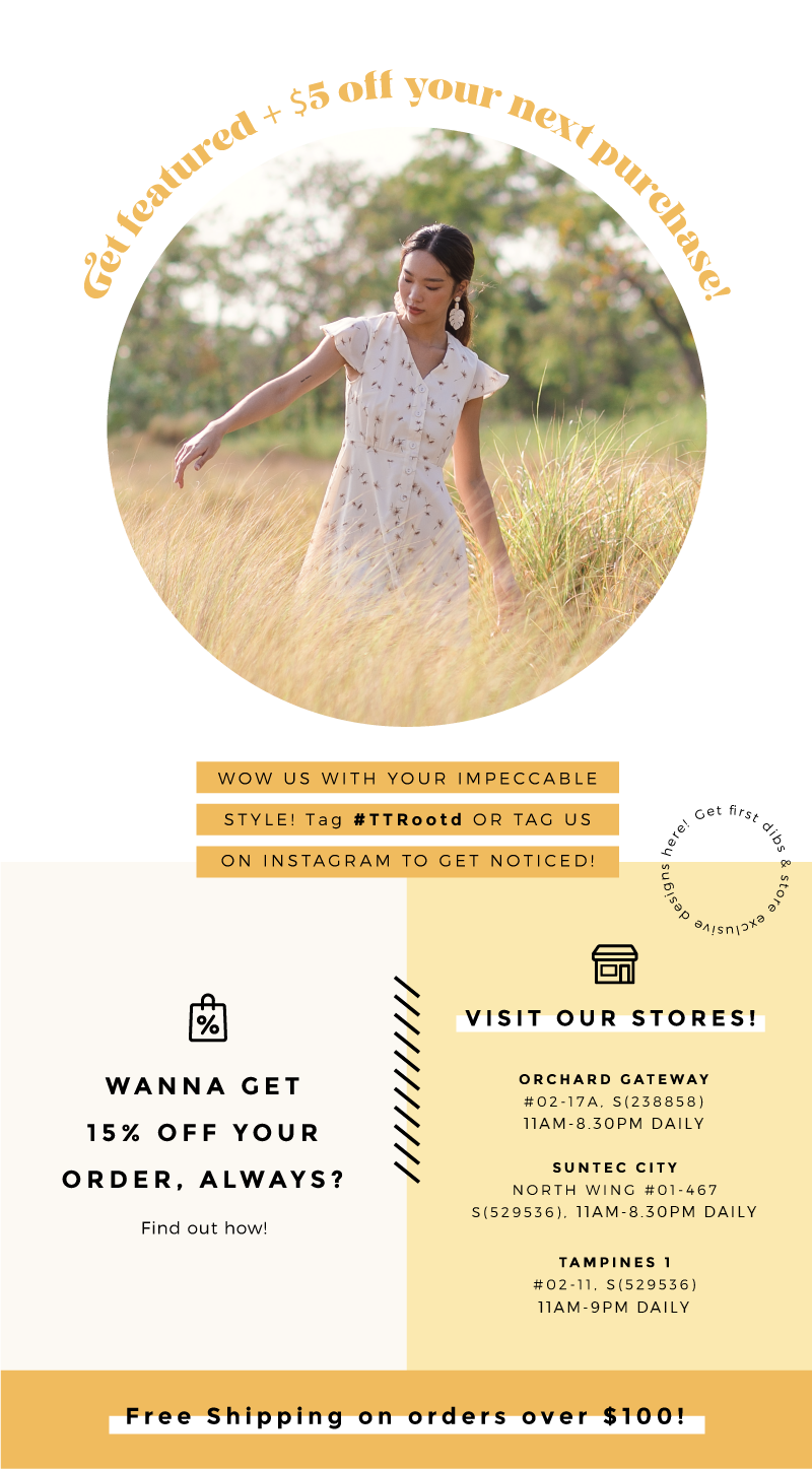 4 hrs Redeem a FREE capbucket hat worth 2690 of your choice on us exclusively in stores when you shop above 80 in stores Psst new arrivals are freshly landed in stores too. On top of that it is one of the few blogshops in Singapore that stocks its own graphic T-shirts. Treat yourself to original TTR pastel prints for a cute brunch outfit and drop by its stores to feel the designs.